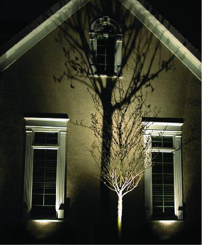 This design and install of outdoor landscape lighting is located in Medford N.J. Dramatic shadowing when designed into the proper location can leave a lasting impression.